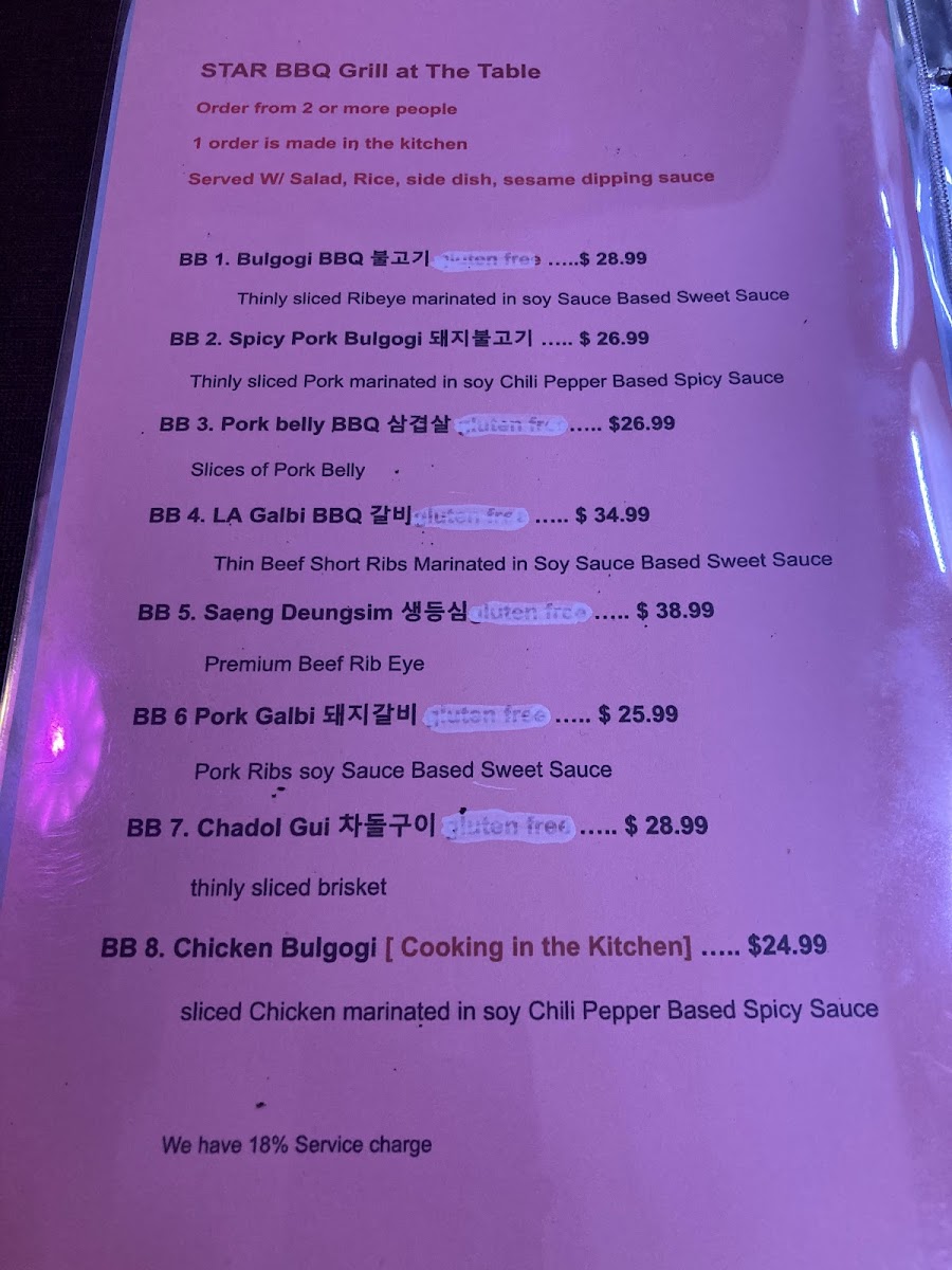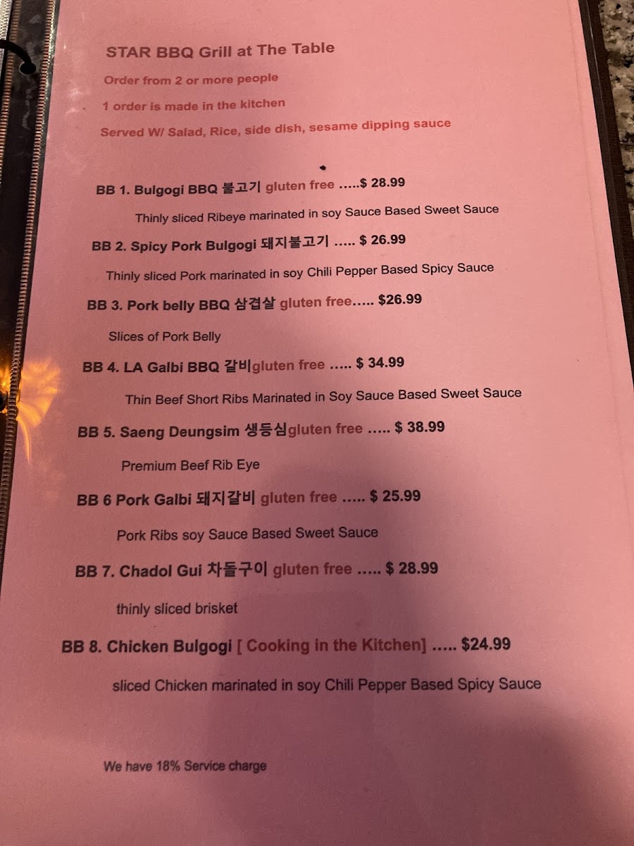 The menu at Star BBQ offers a balanced selection of Korean barbecue favorites and comforting dishes designed for shared enjoyment. It has a casual, inviting feel that suits everything from relaxed weeknight dinners to special family gatherings. Whether you’re grilling La Galbi BBQ at the table or savoring a hearty bowl of Galbi Dolsot Bibimbap, the menu invites a leisurely pace and a communal dining experience.